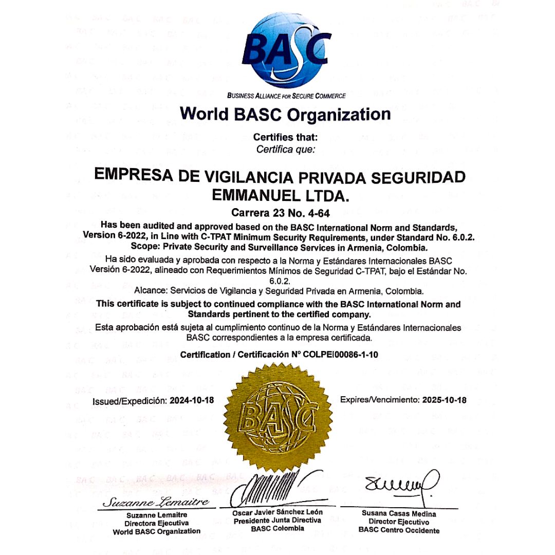 En un importante logro para nuestra organización, nos complace informar que Seguridad Emmanuel ha obtenido la certificación otorgada por la World BASC Organization (Business Alliance for Secure Commerce), demostrando nuestro cumplimiento con los estrictos requisitos de la norma y los estándares BASC versión 6-2022. Este reconocimiento subraya nuestro compromiso con la seguridad y las mejores prácticas en el manejo de operaciones seguras y confiables.